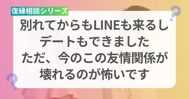 1.相談内容:別れたにも関わらずLINEもしてデートもしてハートのスタンプなども来ているが、どうしたらいいかわかりません。今の友情関係が崩れてしまうのが怖いです。